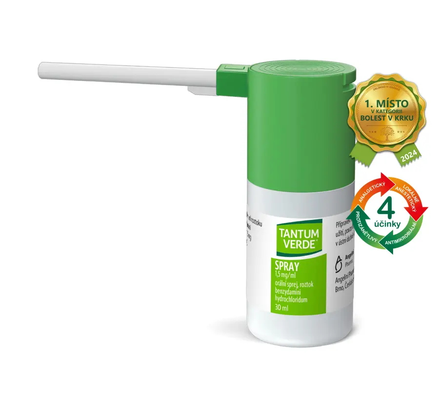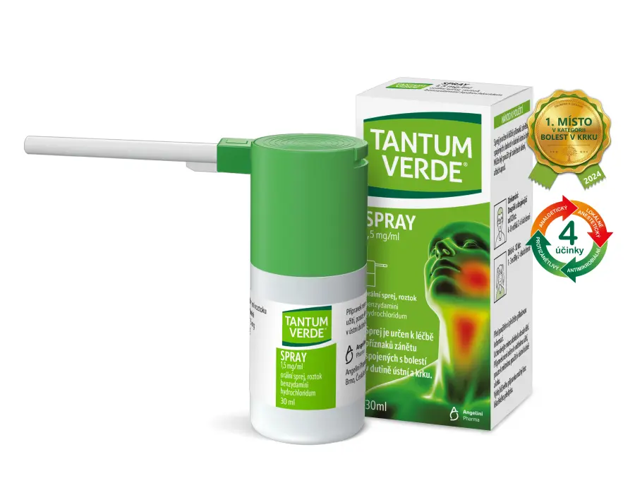 Lék na bolest i záněty v krku a ústech. Léčivá látka v Tantum Verde Spray potlačuje zánět, který se projevuje bolestí, zarudnutím, otokem a ztepláním postiženého místa.