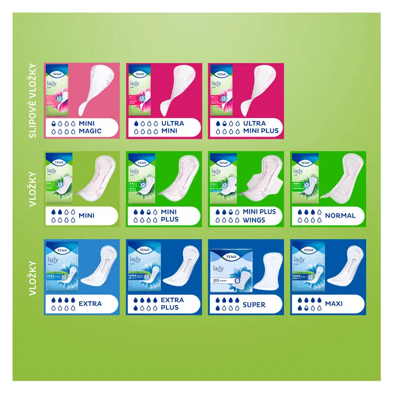 Slipové vložky TENA Lady jsou speciálně vyvinuté pro ženy s velmi lehkým únikem moči. Poskytují trojí ochranu proti protečení, vlhkosti a zápachu.