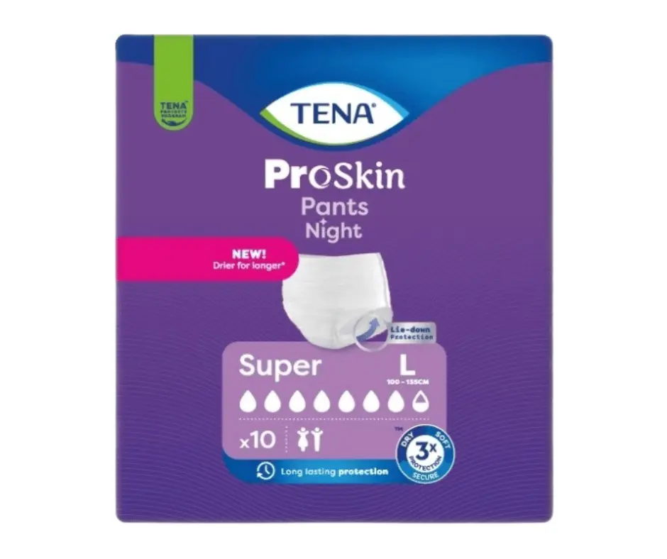 TENA ProSkin Pants Night Super Large inkontinenční kalhotkyjsou určeny pro střední až těžkou inkontinenci a jsou navrženy k použití během noci. Lze je nosit stejným způsobem jako běžné spodní prádlo. Poskytují vyšší absorpci v zadní části díky speciálnímu tvarování absorpčního jádra, což zajišťuje absolutní ochranu během spánku. Rychlejší absorpce pomáhá udržovat pokožku v suchu a tvarované elastické bariérky chrání proti přetečení. Kalhotky se používají stejně jako běžné spodní prádlo.