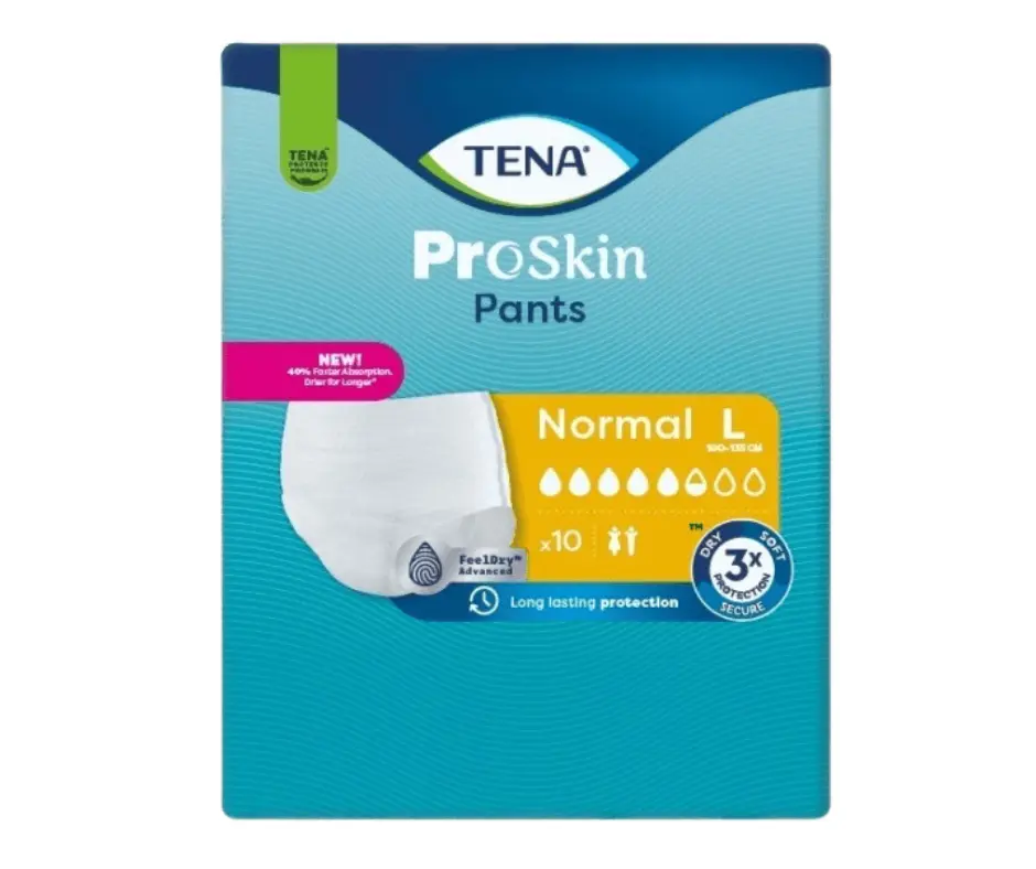TENA Proskin Pants Normal Large inkontinenční kalhotky jsou navrženy pro střední až těžkou inkontinenci. Vyrobené z jemnějšího materiálu, jsou příjemné na nošení a lze je nosit stejným způsobem jako běžné spodní prádlo. Kalhotky mají vylepšené bariérky s navýšeným počtem gumiček v nohavičkách, což zajišťuje lepší ochranu proti protečení. Elastické gumičky umístěné ve směru délky absorpčního jádra udržují tvar i při výrazném nasátí tekutiny, zatímco speciální tvarování absorpčního jádra lépe vyhovuje anatomickým potřebám. Tím se zajišťuje diskrétnost a pohodlí při nošení.