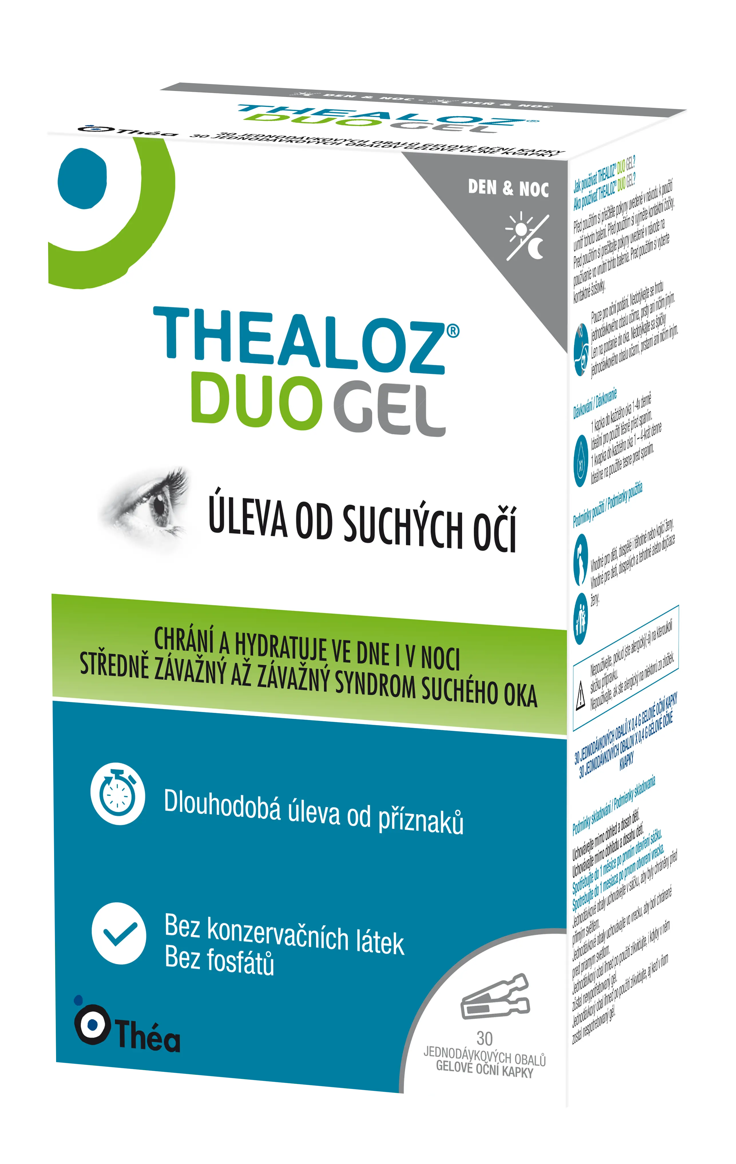 Thealoz Duo Gel lubrikuje a hydratuje povrch oka při léčbě středně závažného a závažného syndromu suchého oka. Taktéž zmírňuje příznaky způsobené faktory, jako je vítr, klimatizace, cestování letadlem, suché teplo, nebo práce na počítači. Neobsahuje konzervační látky.