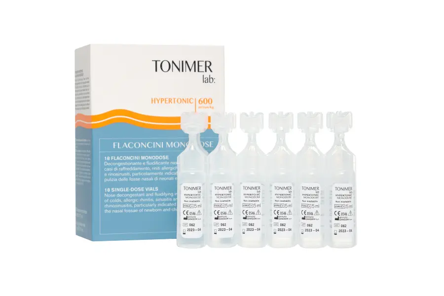 TONIMER lab Hypertonic 600mOsm/kg jednodávkové ampule je sterilní hypertonický roztok mořské vody, dekongestivum nosní sliznice a zkapalňující hlen. Je indikován k vytírání nosních jamek novorozenců a dětí při nachlazení a zejména ke snížení otoku nosních sliznic v akutních stadiích. alergické rýmy, zánětu nosních dutin a vedlejších nosních dutin. Vhodný také pro použití v inhalátorech.