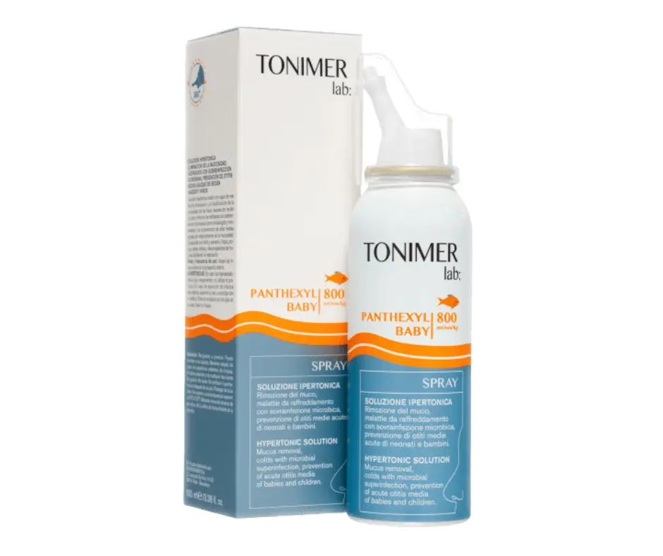 Tonimer Lab Panthexyl Baby Sprej 800 mOsm/kg 100ml je sterilní hypertonický roztok s mořskou vodou k odstranění a zkapalnění hlenu v nosních dutinách určený pro novorozence a děti při nachlazení s mikrobiální superinfekcí, jako je zánět nosohltanu, zánět nosních dutin, k prevenci akutního zánětu středního ucha působeného nahromaděním hlenu ve středouší. Obohacený o xylitol a panthenol pečuje o hygienu, chrání, zklidňuje, hydratuje a uvolňuje sliznice a zlepšuje dýchání.