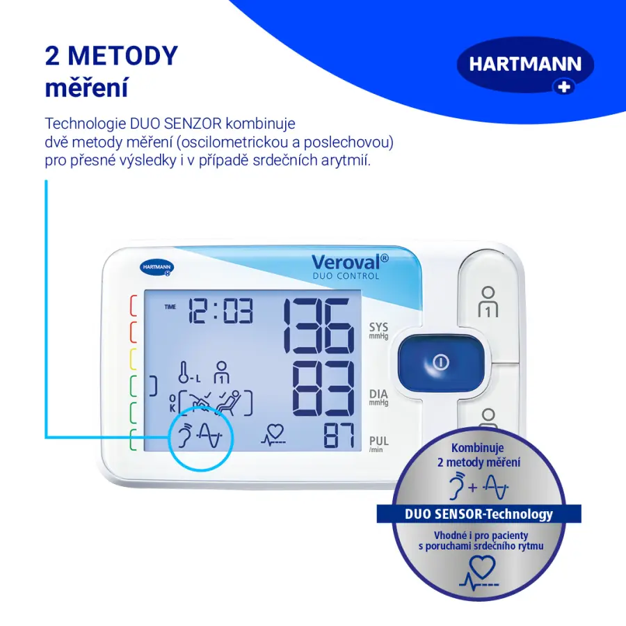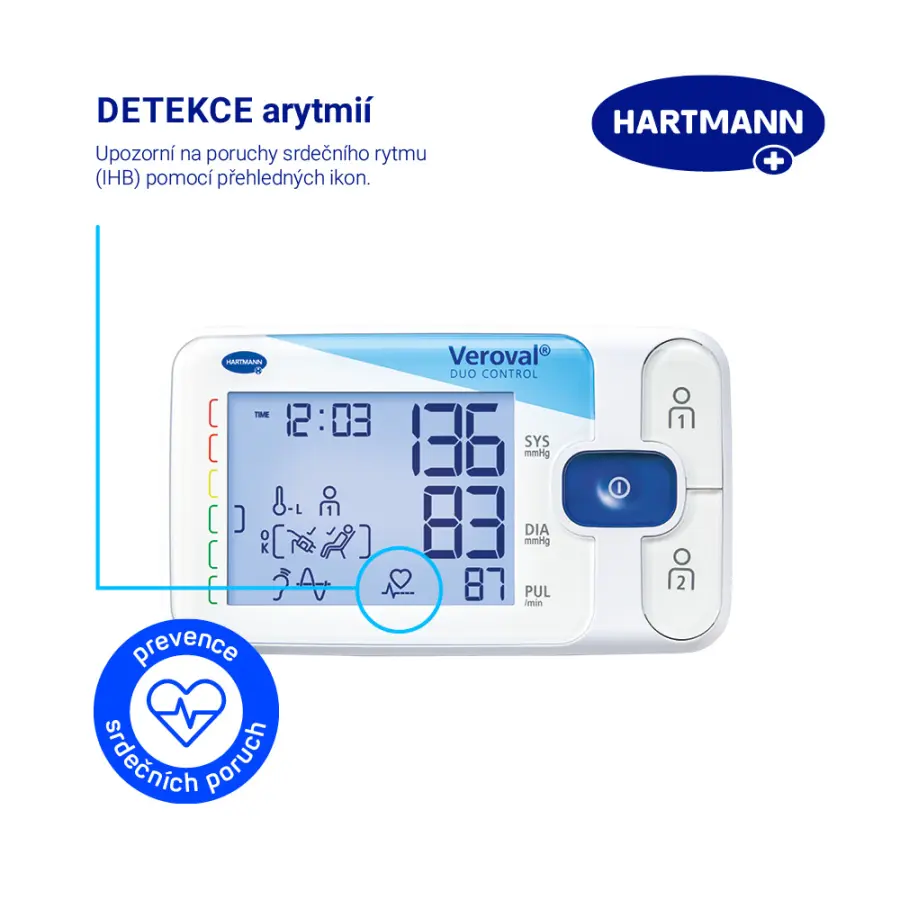 Nejvyspělejší pažní tlakoměr HARTMANN Veroval duo control kombinuje 2 metody měření tlaku pro odhalení srdeční arytmie a co nejpřesnější výsledky jakou lékaře.