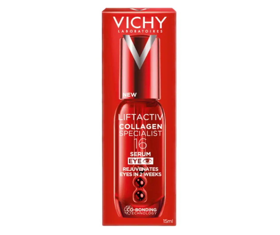 LIFTACTIV Collagen Specialist 16 Oční sérum je první oční sérum s technologií Co-Bonding [Ramnóza, Peptidy, Maitake], která pomáhá posilovat a vzájemně vázat všechny typy kolagenů. Díky tomu podporuje pevnost, pružnost a mladistvý vzhled očního okolí. Již po 2 týdnech používání je oční okolí viditelně omlazené, vrásky a jemné linky jsou redukovány a tmavé kruhy méně patrné. Účinnost je podpořena inovativním trojitým chladivým aplikátorem, který zajišťuje svěží pocit při každé aplikaci. Sérum má čirou, průsvitnou texturu, je testováno pod dermatologickou i oftalmologickou kontrolou a je vhodné pro každodenní použití.