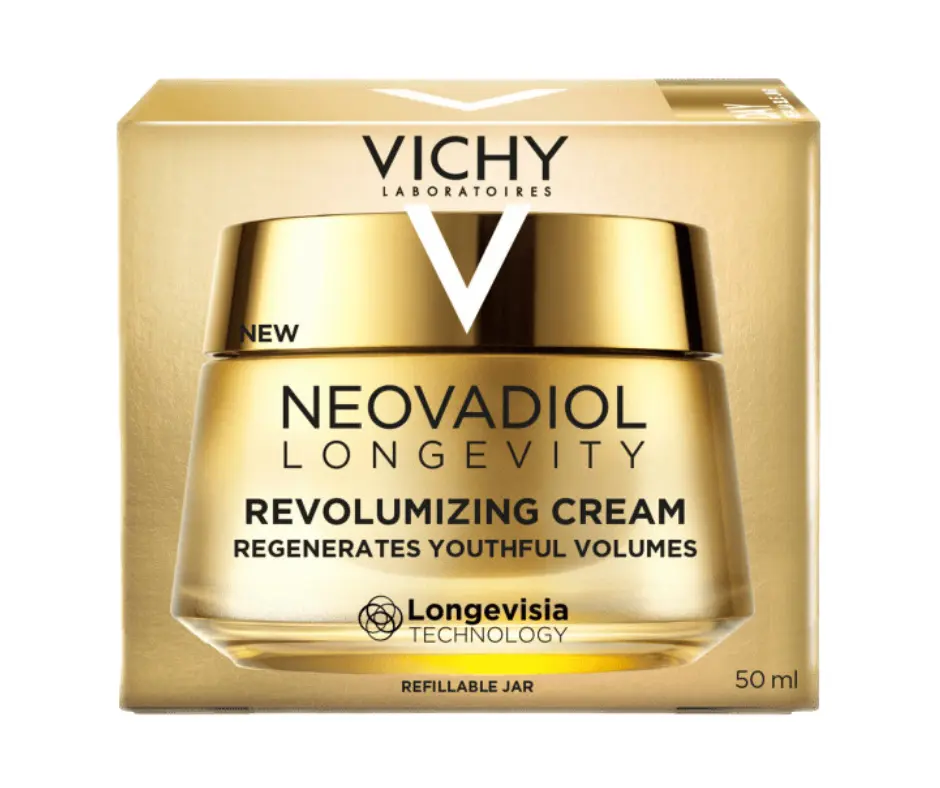 Vichy Neovadiol Longevity revitalizační krém je speciálně navržen pro zralou pleť po 50. roce života, kdy buňky ztrácí schopnost regenerace. Díky 13% technologii LongevisiaTM (Proxylane, Niacinamide, Senevisium), která je výsledkem více než 20 let výzkumu, obnovuje schopnost buněk regenerovat a podporuje tvorbu nové kožní tkáně až o 31 %*. Krém má hedvábnou texturu, která se rozplývá na pokožce, zanechává ji pevnější, vyživenou a s viditelně větším objemem v oblastech čela, kontur očí, tváří, koutků úst a kontur. Klinické studie ukazují až 42% zvýšení objemu tváří**. Ideální pro každodenní použití ráno i večer na obličej a krk.