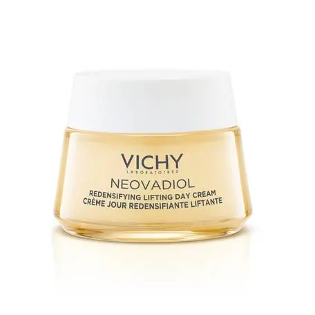 Vichy Neovadiol Menopause denní krém pro období perimenopauzy - suchá pleť. Hormonální změny v období kolem menopauzy urychlují stárnutí pleti, která ztrácí elasticitu a hutnost. Kontury jsou méně vyrýsované. Laboratoře Vichy vyvinuly lehký krém s obsahem Termální vody Vichy vulkanického původu obohacené o 15 minerálů, Proxylanu, výtažku z kasie a kyseliny hyaluronové. Pomáhá kompenzovat dopady perimenopauzy na vzhled pleti - pleť se zdá hutnější, vyplněná a působí pevněji.