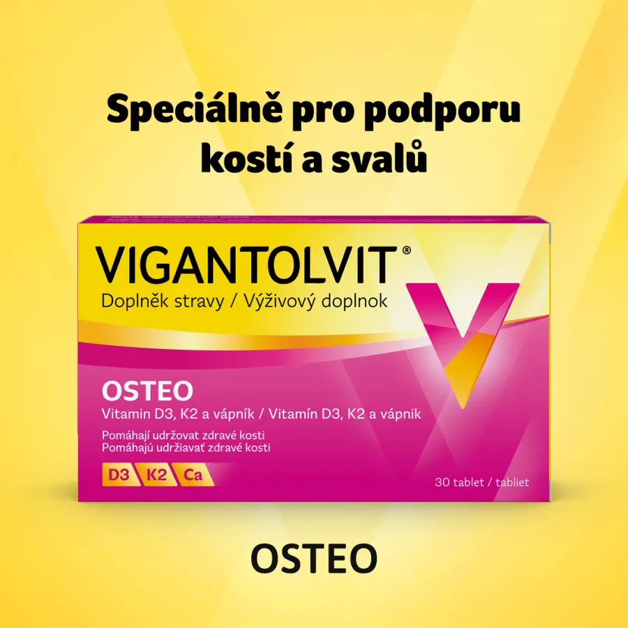 Vigantolvit Osteo poskytuje vitamin D3, K2 ve formě MK-7 a vápník pro specifickou péči o zdraví vašich kostí. Tím pomáhá udržet vaše tělo v dobré kondici a užívat si tak vše, co máte rádi. Vigantolvit Osteo poskytuje 3 základní látky pro zdraví kostí: vitamin D3, K2 a vápník. Vitamin K2 je přítomen ve formě MK-7.