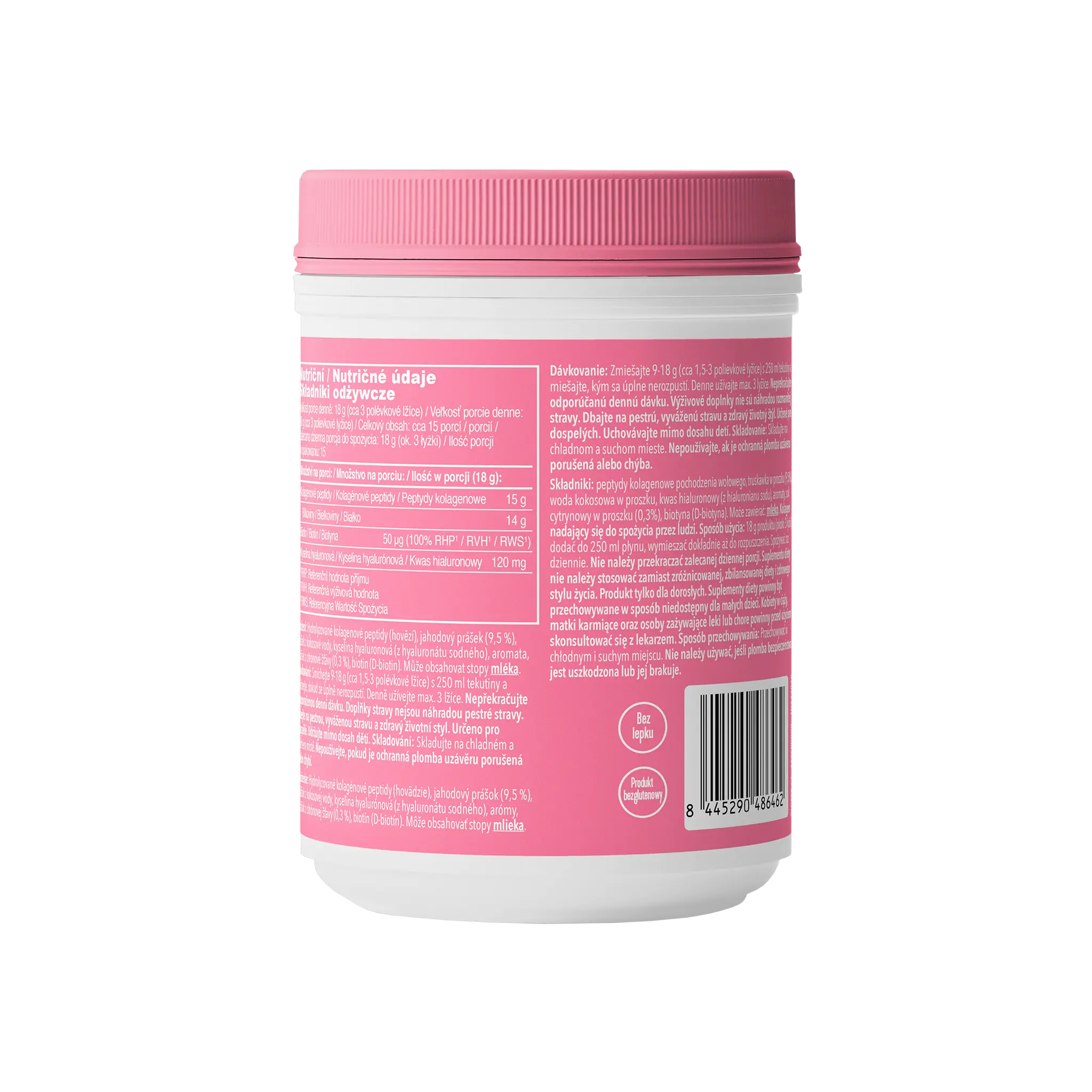 Hydrolyzované kolagenové peptidy (hovězí), jahodový prášek (9,5 %), prášek z kokosové vody, kyselina hyaluronová (z hyaluronátu sodného), aromata, prášek z citronové šťávy (0,3 %), biotin (D-biotin). Může obsahovat stopy mléka.