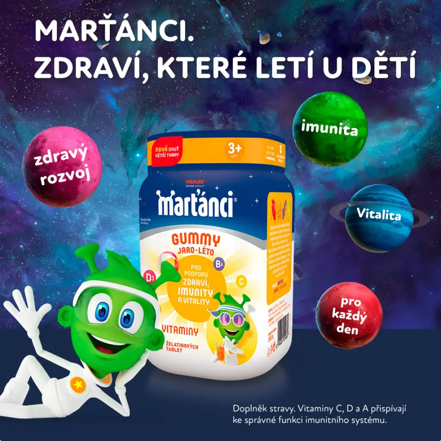 Pokud jde o výběr kvalitního dětského multivitaminu v jarním a letním období, je důležité najít nejen ten, který vašim dětem chutná, ale zároveň ten, který obsahuje široké spektrum důležitých vitaminů v doporučených denních dávkách. A takoví jsou Marťánci Gummy Jaro - léto! Dejte dětem chutné a zábavné Marťánky a podpořte tak jejich imunitu i na jaře a v létě!