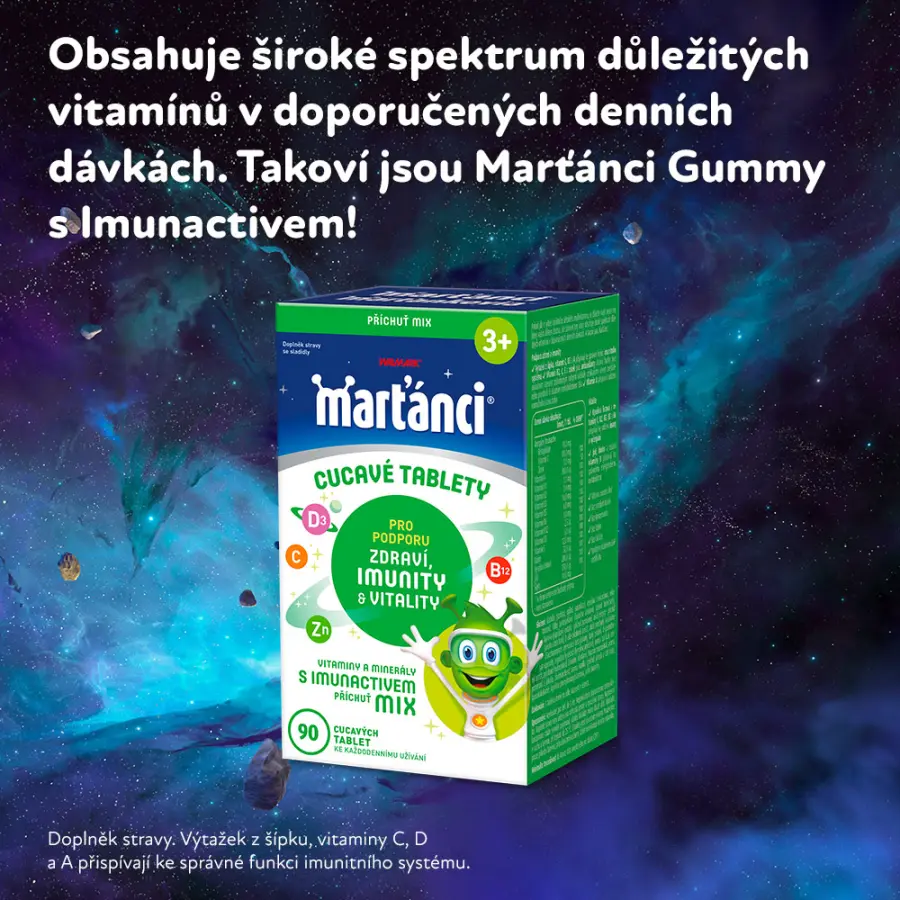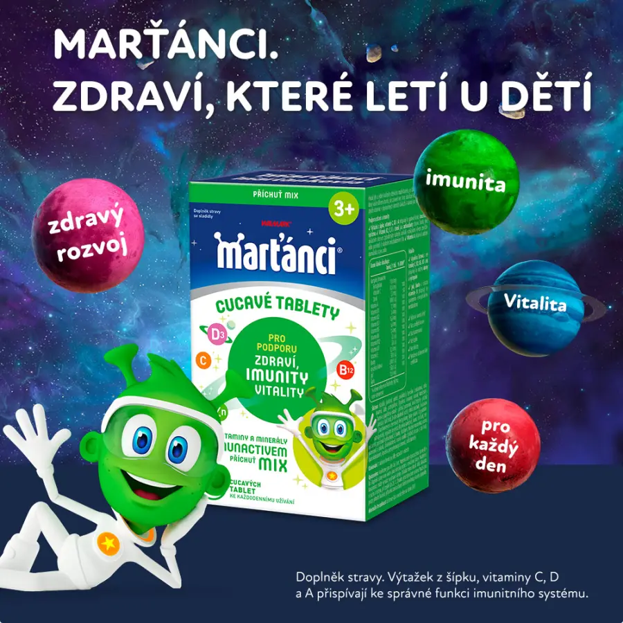 Multivitaminy pro děti s betaglukany z přírodních zdrojů. Cucací Marťánci s vitaminem C, D3, zinkem a výtažkem z šípku pro podporu imunity.